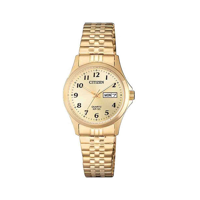 This watch features a gold toned dial with black numbers and a day date window. The case of the watch measures 26mm and is yellow gold-plated as is the matching stretch band.