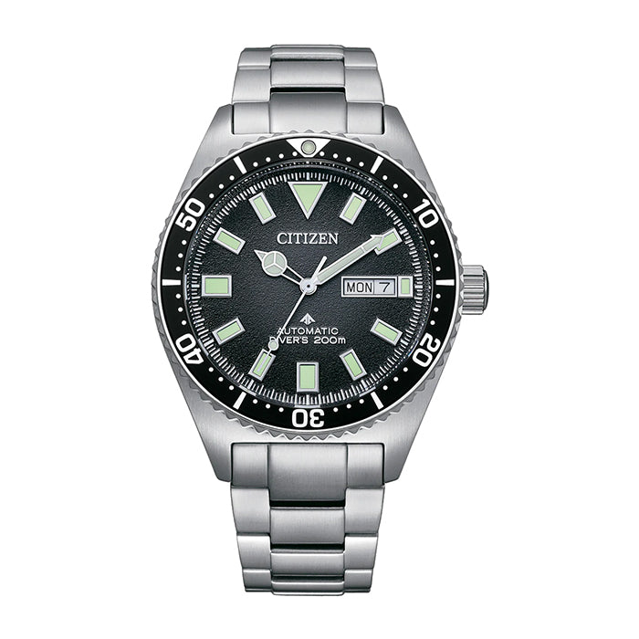 This watch features a textured black dial with silver toned hands and features that have luminescent hands as well as a day and date window. The case of the watch features a black, rotating bezel and is 41mm wide, made from stainless-steel. The look of the watch is finished off with a matching stainless-steel band.