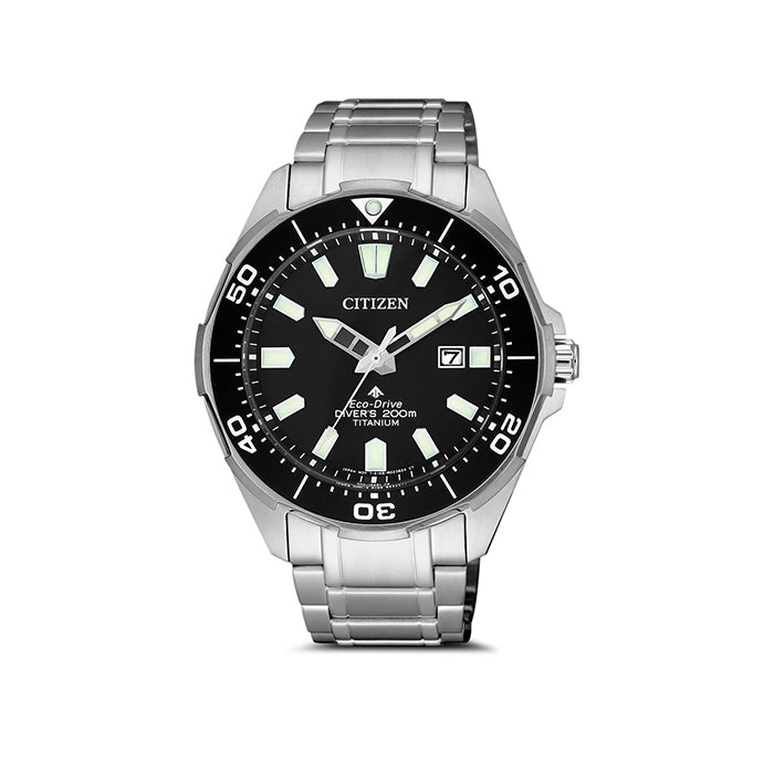This professional dive watch is from the CITIZEN sea collection and meets dive watch regulations. The dial of the watch is a crisp black with luminescent hands and hour markers. The dial also features a date window. The case of this watch measures 43.5mm and features a one-way rotating bezel. The case and band of the watch are crafted from titanium for strength and to make it light weight.
