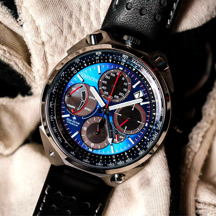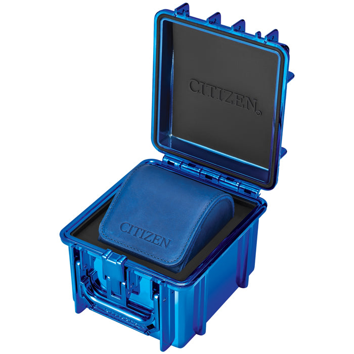 LIMITED EDITION TSUNO CHRONO RACER: Commonly referred to as the ‘BULLHEAD’ due to the button layout centring on the 12 o’clock marker, there for resembling bull horns. This watch features a metallic blue dial with black sub dials highlighted by white and red accents, silver toned hands and markers, as well as a date window, alarm and power reserve indicator – all protected by sapphire crystal glass. The case of the watch is made from titanium and measures 43mm wide. The look of this watch is finished off with a contrasting black leather band. This watch is limited to 2500 pieces worldwide and comes in a Promaster tackle box.