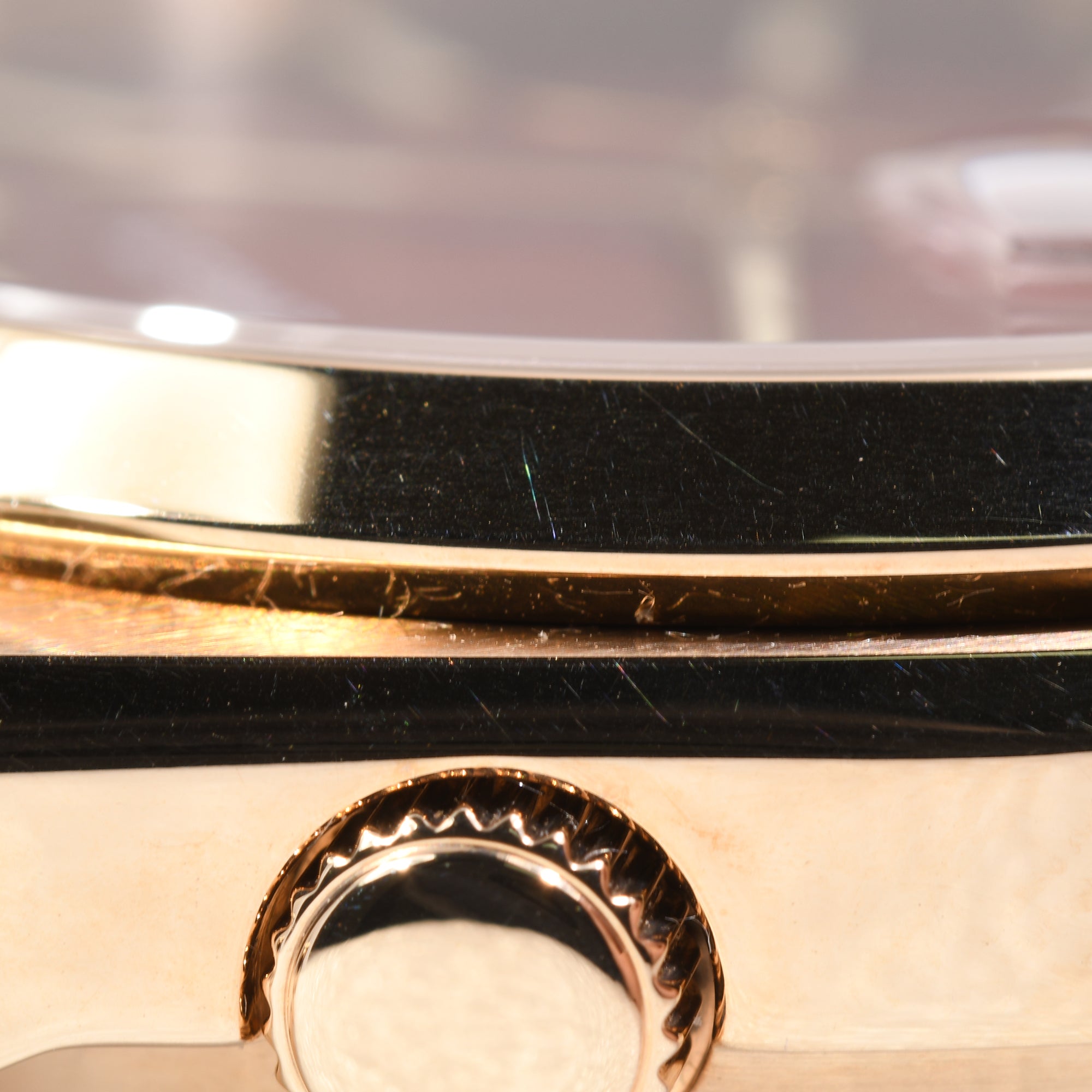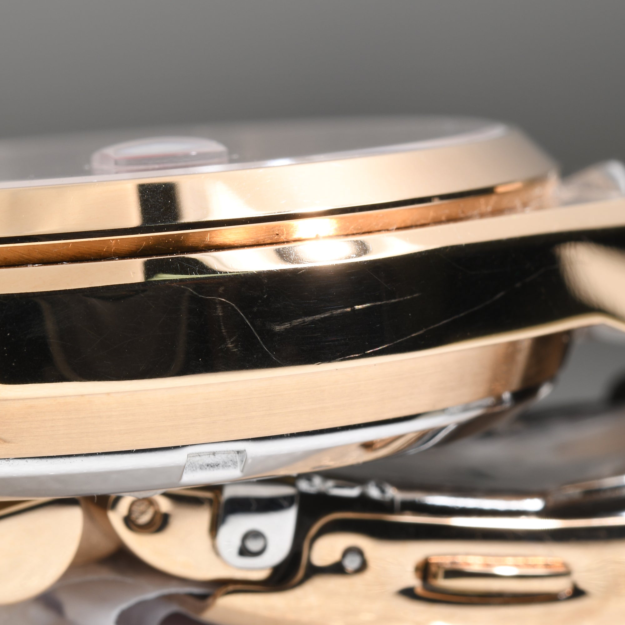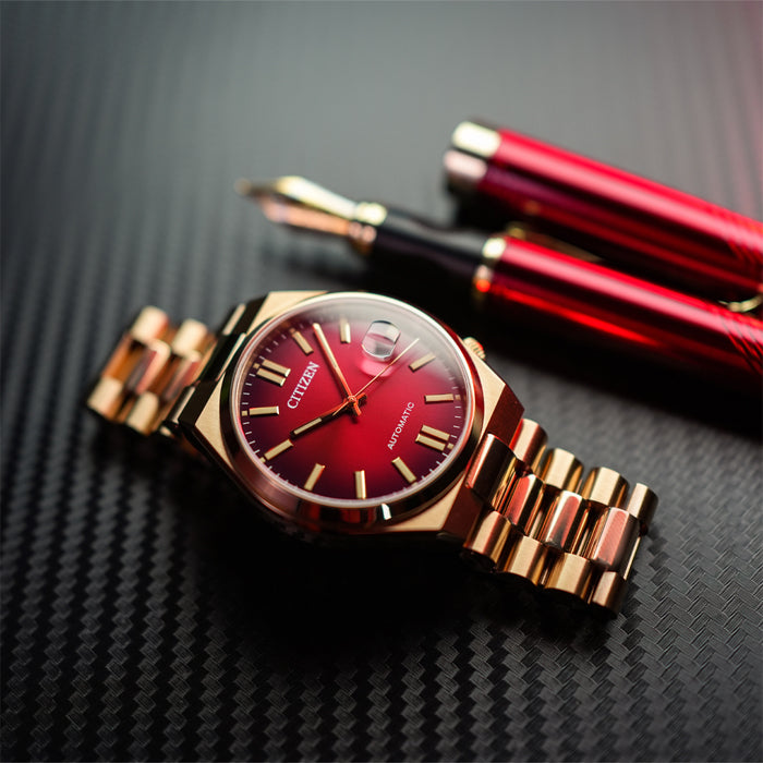This watch features a sunray metallic fire red dial with luminous rose gold-toned hands and off-white colour markers, as well as a date window with magnifier, all protected by sapphire crystal glass. the case of the watch is 40mm in rose gold-toned stainless-steel, as is the matching integrated band.