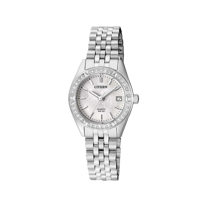 This watch features a mother of pearl toned dial with silver toned features as well as a date window. The case of the watch is 26mm and set with crystals, it is made out of stainless-steel as is the matching band.