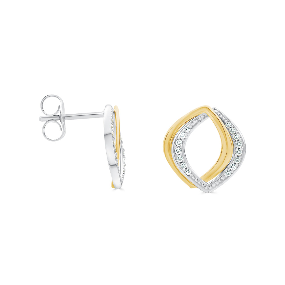 These earrings are made from 9ct white and yellow gold. Each one features a diamond shaped design made yellow gold and interlocked with the same shape in white gold that is set with bead set diamonds. These earrings feature a stud fitting.