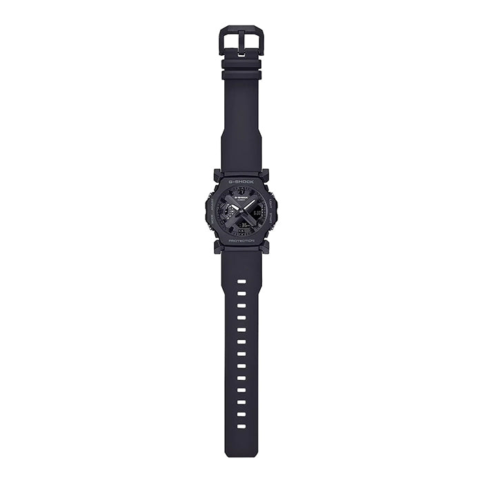 This watch features a black dual digital and analogue display. The 45.4mm case of the watch is only 11.6mm thick and made from black resin as is the matching band.