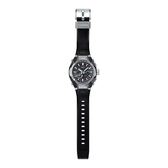 This watch features a black dial with silver toned features and blue highlights, all protected by sapphire crystal glass. The case of watch is stainless-steel with a carbon core and measures 45.3mm. The look of the watch is finished off with a black resin band.