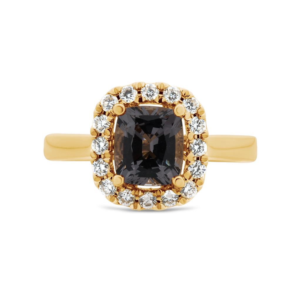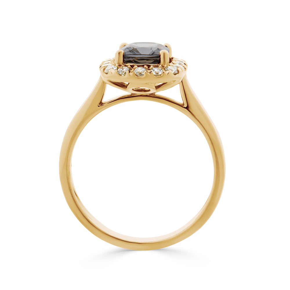Designed by a staff member here at WATSONS this ring features a cushion cut grey spinel in the centre, claw set in 9ct yellow gold, the spinel is surrounded by a halo of diamonds, also claw set in 9ct yellow gold.