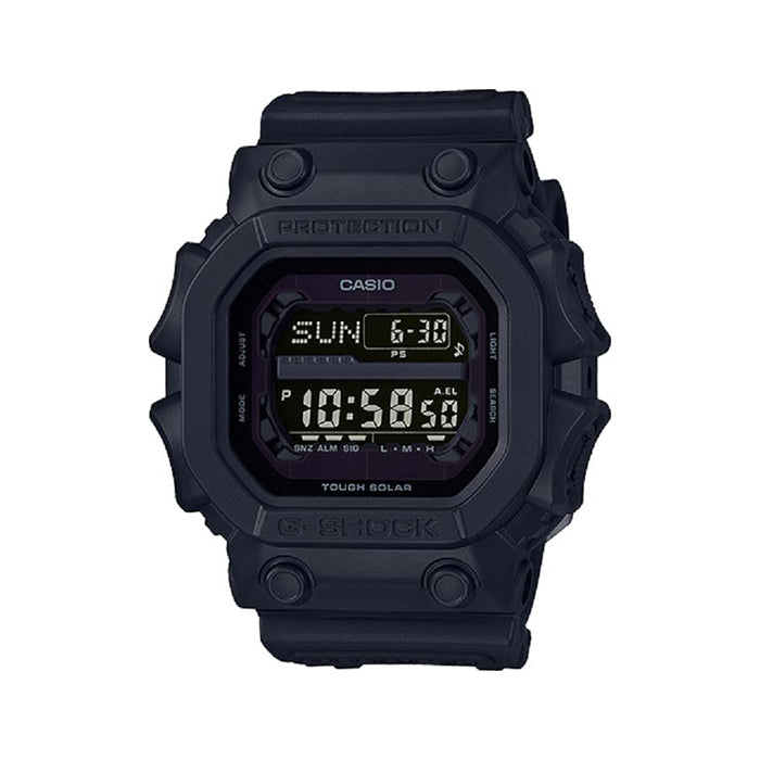This watch features a digital display with a patterned black surround. The 53.6mm case is made from black resin, as is the matching band.