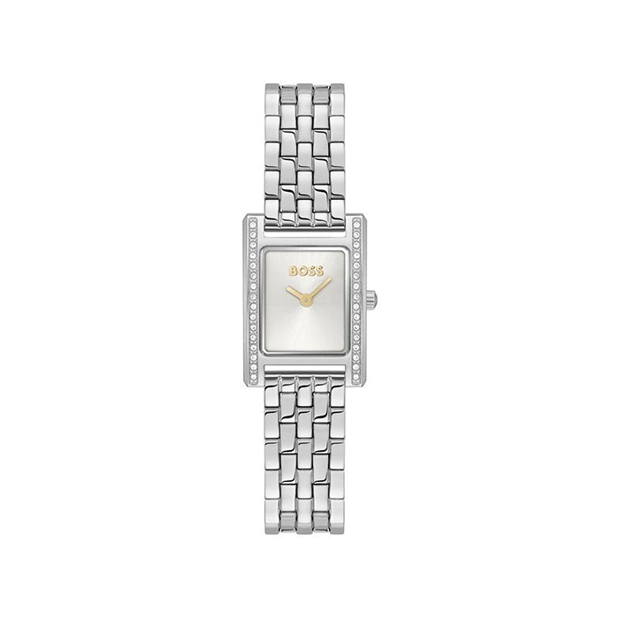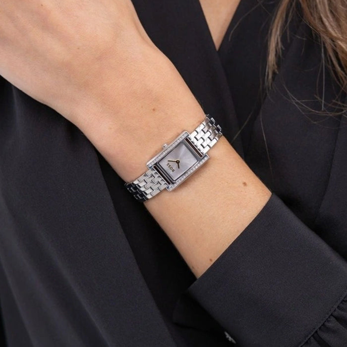 LUCY PRECIOUS: This watch features a silver toned dial with yellow gold toned hands. The crystal set case of the watch measures 18.5x23mm and is stainless-steel as is the matching band.
