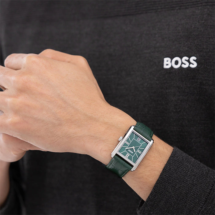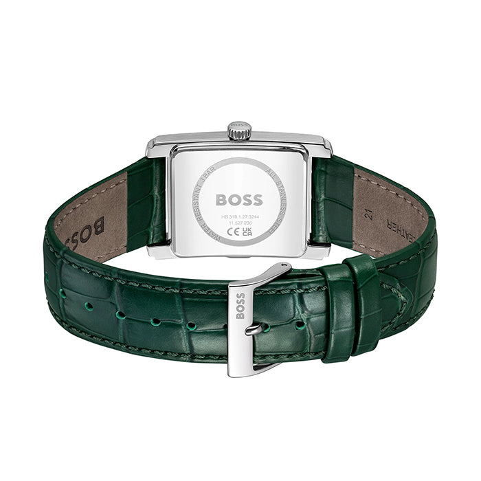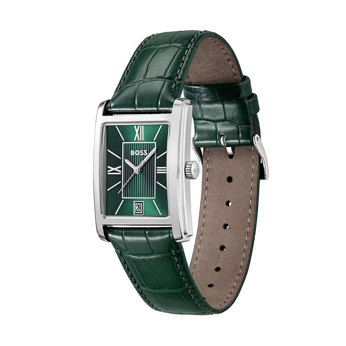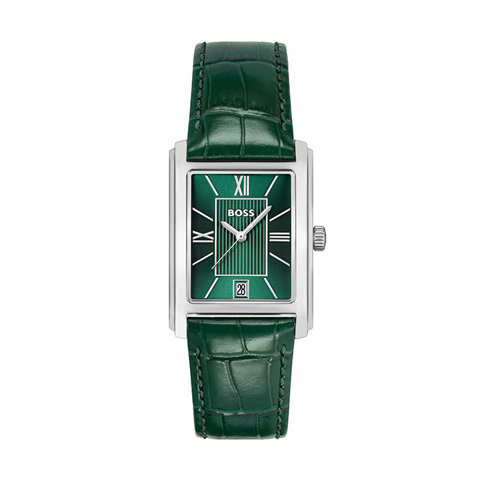 PRINCIPLE DRESS: This watch features a textured green dial with silver toned hands and markers including a date window. The 28mm case of the watch is made from stainless-steel while the look of the watch is finished off with a green alligator leather band.