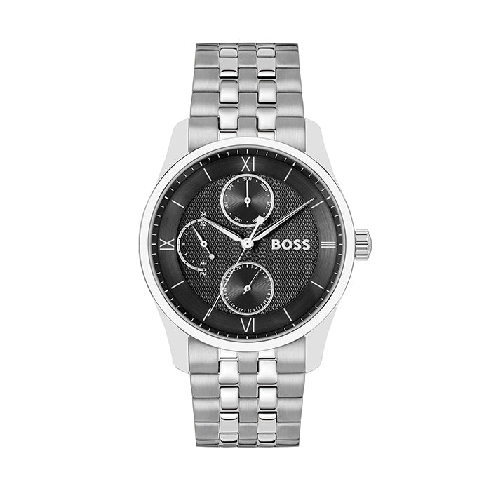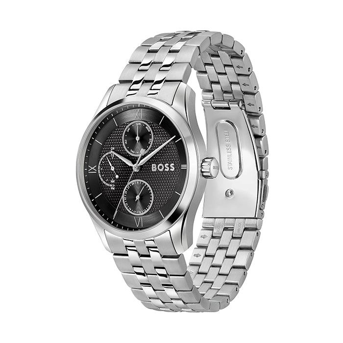 PRINCIPLE MASTER: This watch features a black dial with silver toned hands and features including a day, date and AM/PM sub dials. The 41mm case of the watch is made from stainless-steel as is the matching band.