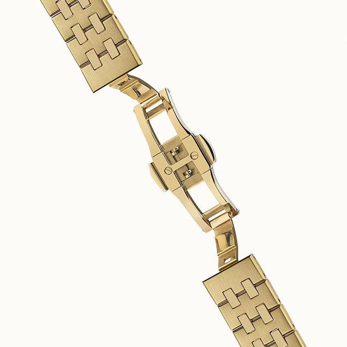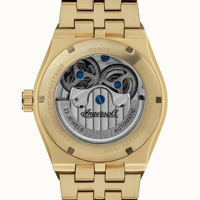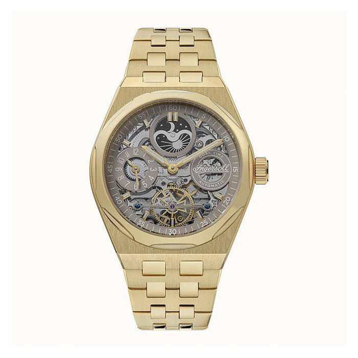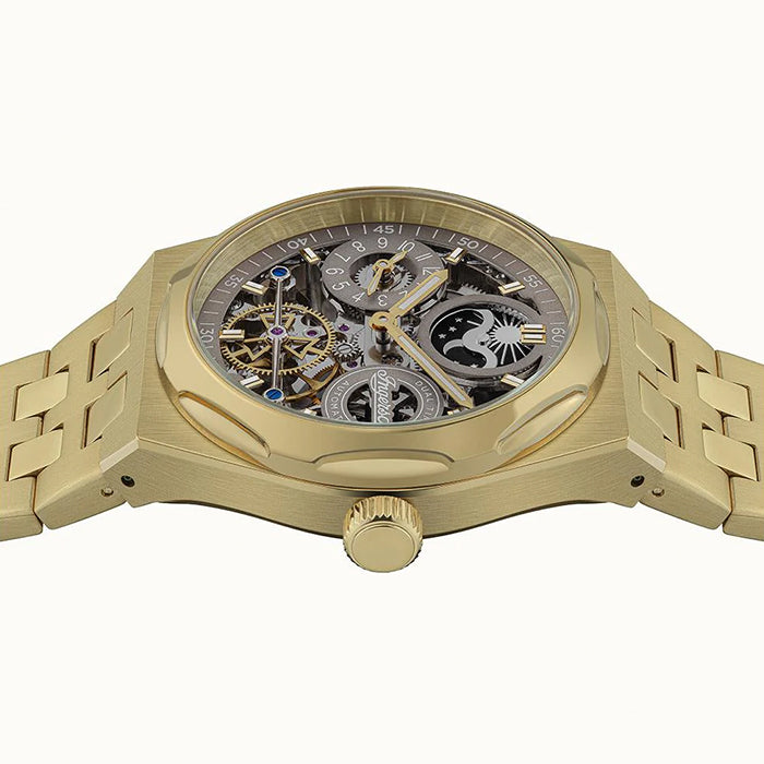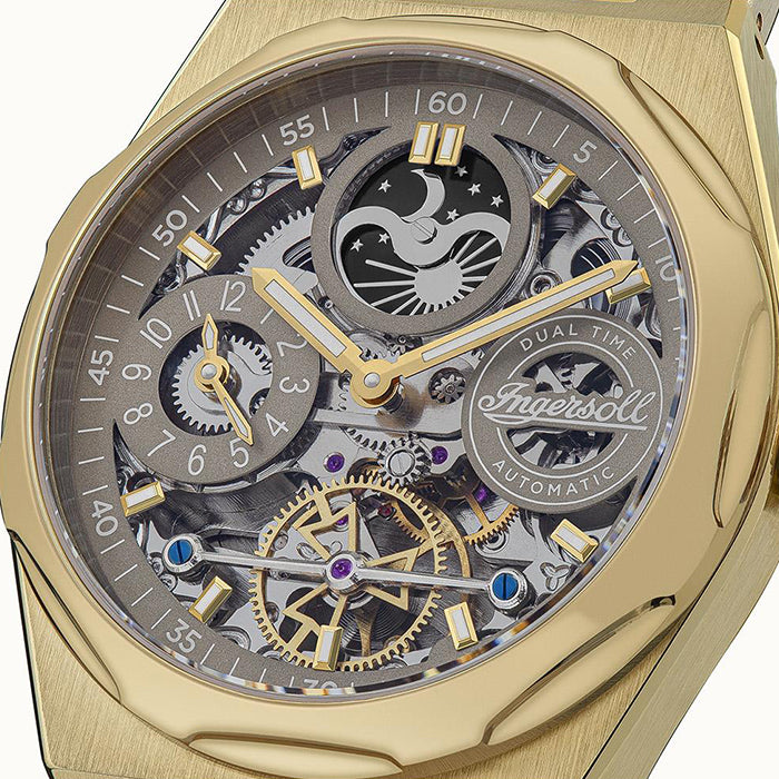 THE BROADWAY: This watch features a fully skeleton dial with yellow gold toned features including luminescent filled hands and markers. The watch also features a dual time sub dial and a sun & moon AM/PM indicator. The 43mm case of the watch features an exhibition case back and is made from yellow gold plated stainless-steel, as is the matching band.