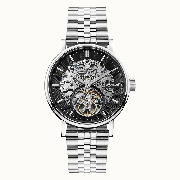 THE CHARLES: This watch features a predominantly skeleton dial with a textured black edge and silver toned, luminescent hands and silver features. The 44mm case of the watch features an exhibition case back and is made from stainless-steel, as is the matching band.