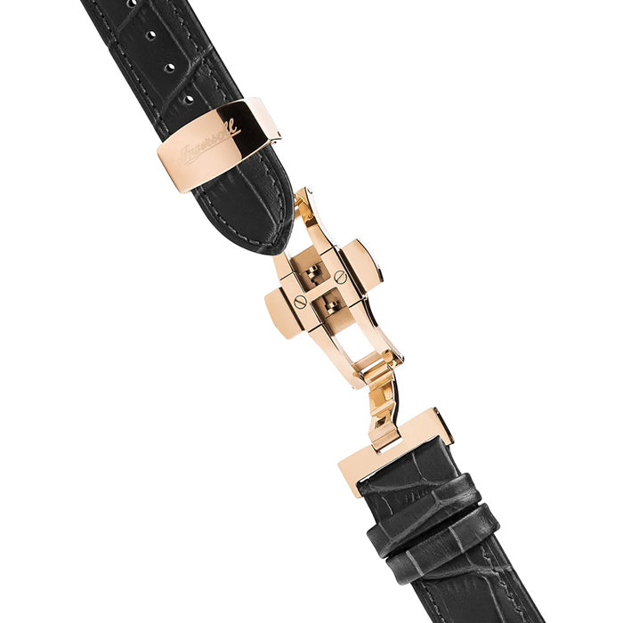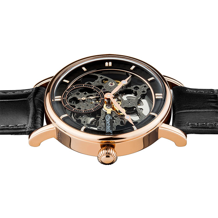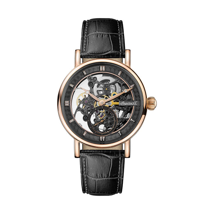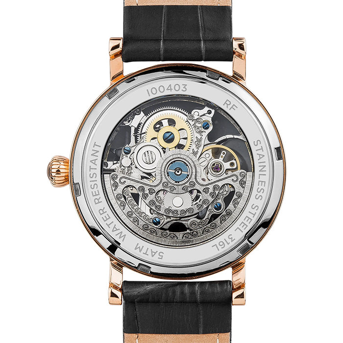 THE HERALD: This watch features a predominantly skeleton dial with a textured black edge and rose gold toned hands and a seconds hands sub-dial. The 40mm case of the watch is rose gold-plated stainless-steel and features an exhibition case back. The look of the watch is finished off with a black leather band.
