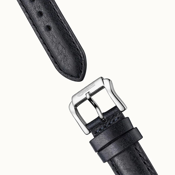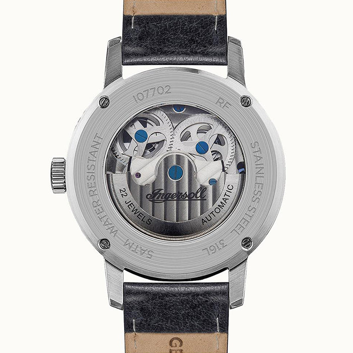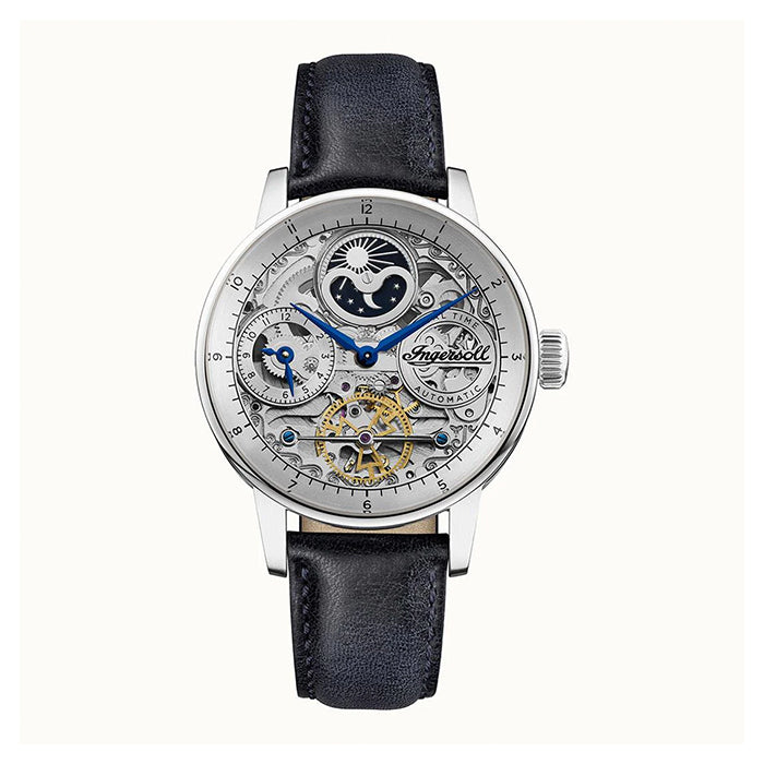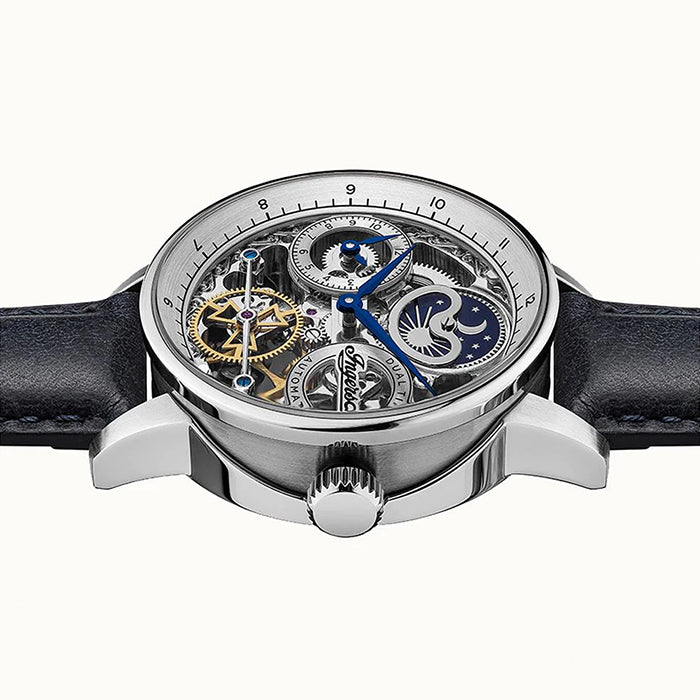 THE JAZZ: This watch features a silver skeleton dial with metallic blue toned hands and black features as well as a dual time sub-dial and sun & moon, AM/PM indicator. The 42mm case of the watch is stainless-steel and features an exhibition case back. The look of the watch is finished off with a black leather band.