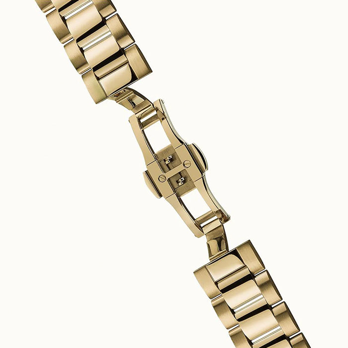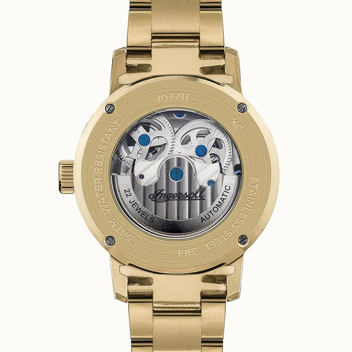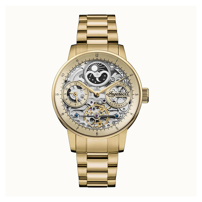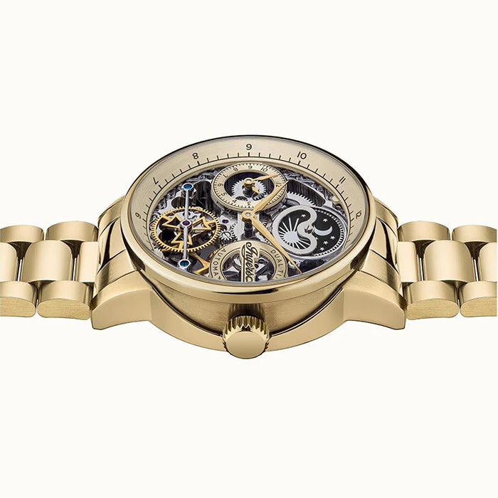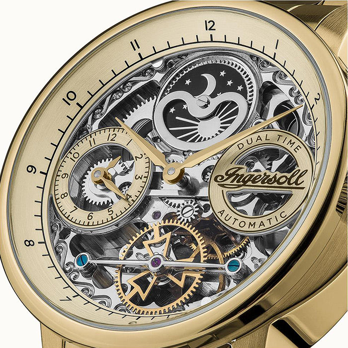 THE JAZZ: This watch features a skeleton dial with yellow gold toned hands and features including a dual time sub dial and a sun & moon AM/PM indicator. The case of the watch measures 42mm wide and 15.3mm thick. It features an exhibition case back and is made from yellow gold plated stainless-steel, as is the matching band.