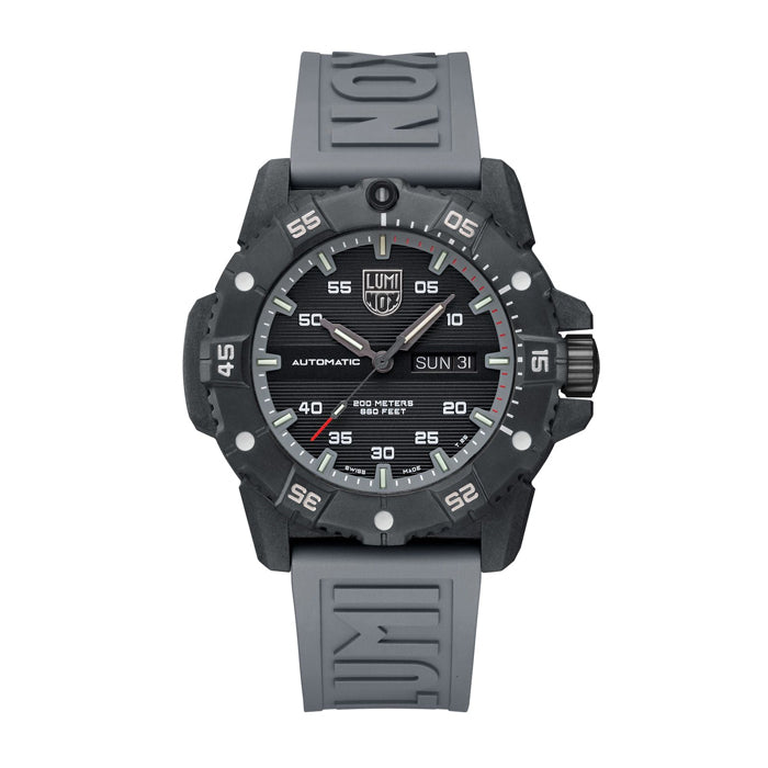 MASTER CARBON SEAL: This watch features a black striped dial with dark silver-tone LLT filled hands, white numbers, LLT filled markers and a day/date window, protected by sapphire crystal glass. The case of the watch is 45mm in CARBONOX with a CARBONOX rotating bezel, and comes on a grey rubber band.