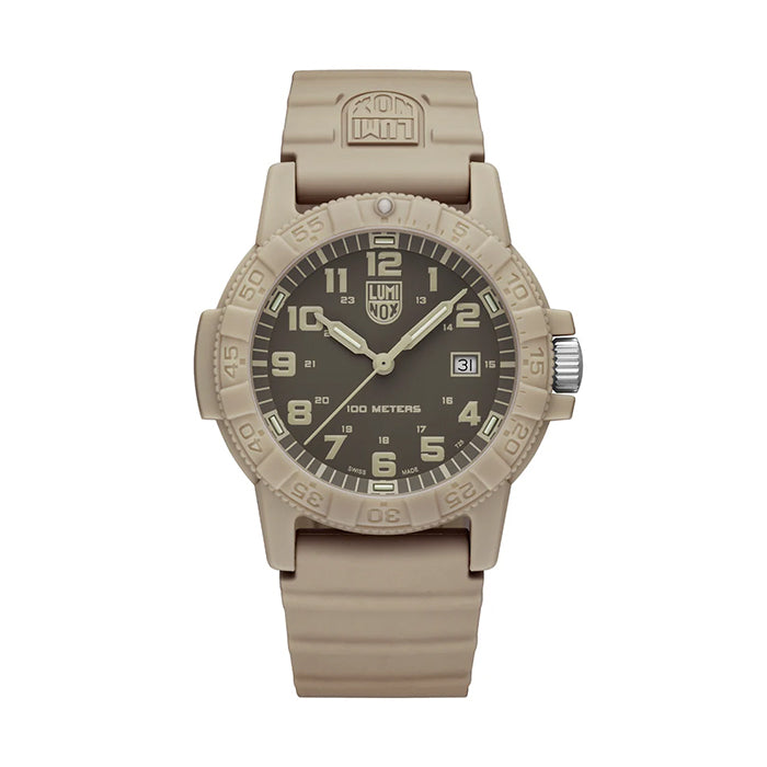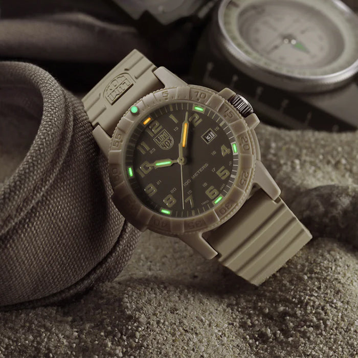 LEATHERBACK TURTLE: This watch features a dark sand dial with khaki LLT filled hands, LLT filled markers, oversized numbers, white highlights and a date window, all protected by sapphire crystal glass. The case of the watch is 44mm in sand coloured CARBONOX, and comes on a matching black polyurethane band.