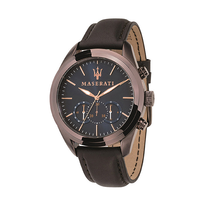 This timepiece features a rich indigo dial with rose gold toned hands including a chronograph feature. The watch has a 45mm case that is plated with an expresso colour. The band of the watch stitched brown leather.
