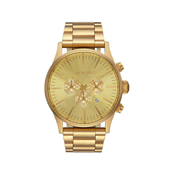This watch features a brushed gold toned dial with gold toned features as well as a date window and chronograph sub dials. The case of the watch is yellow gold-plated and measures 42mm. The look of the watch is finished off with a matching gold-plated band.