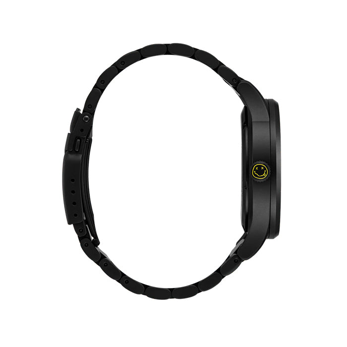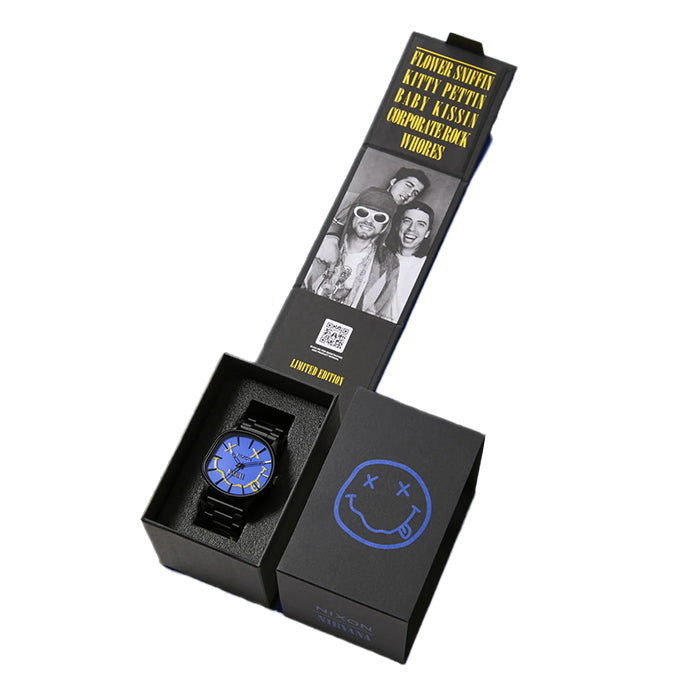BLUE SMILEY: This watch is part of the collaboration range with NIRVANA, featuring a bright blue dial with a copy of Kurt Cobain’s iconic smile graphic on the dial and crown white the out of round case measures 42mm and is made from black plated stainless-steel as is the matching band. This is a limited edition watch and comes in a presentation box.