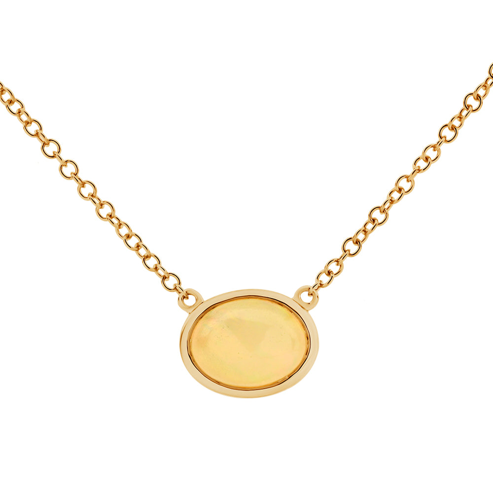 This pendant is made from 9ct yellow gold. It features an oval cut opal in a bezel setting attached to a solid yellow gold, 45cm belcher chain.