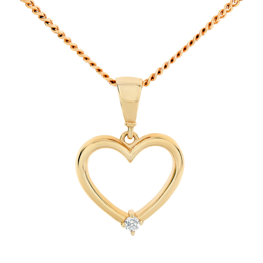 This pendant is made from 9ct yellow gold. This open-heart pendant features a claw set cubic zirconia at the base. This pendant comes on a complimentary 45cm, yellow gold-plated display chain.