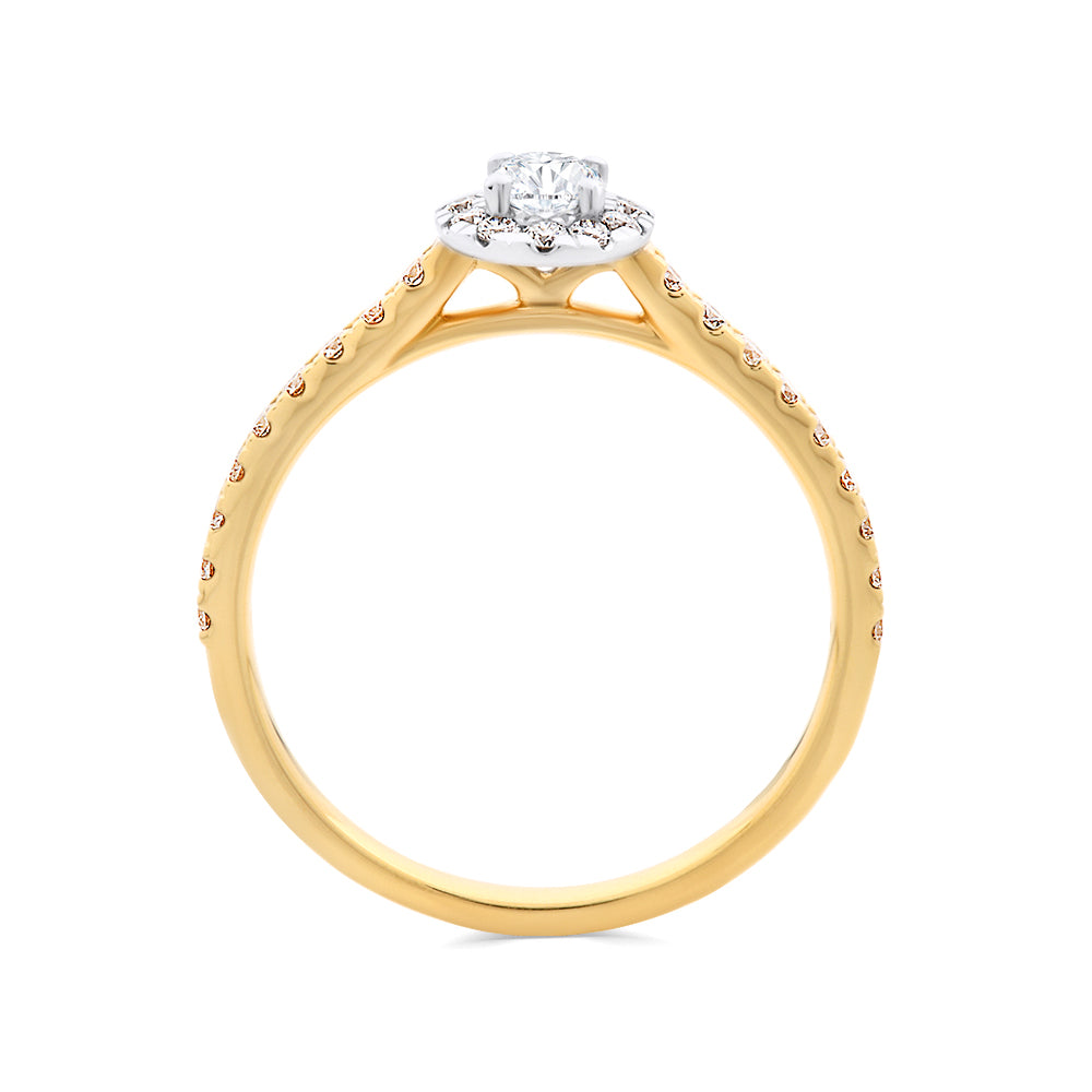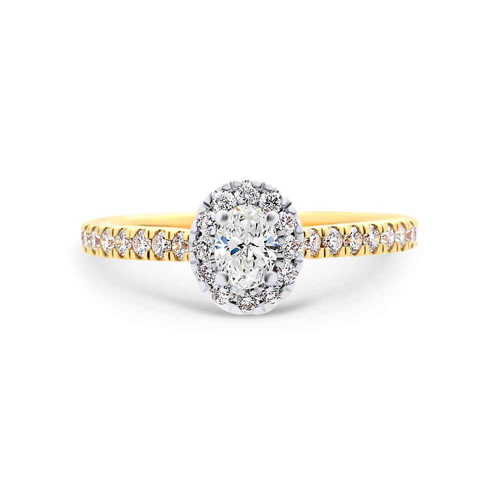 This ring is made from 18ct white and yellow gold. The ring features a 0.30ct oval cut diamond in a white gold, four-claw setting. The centre stone us surrounded by a halo of small round brilliant cut diamonds that are also claw set in white gold. The band of this ring is yellow gold and also has claw set diamond. This ring is designed to fit up against a straight wedding ring.