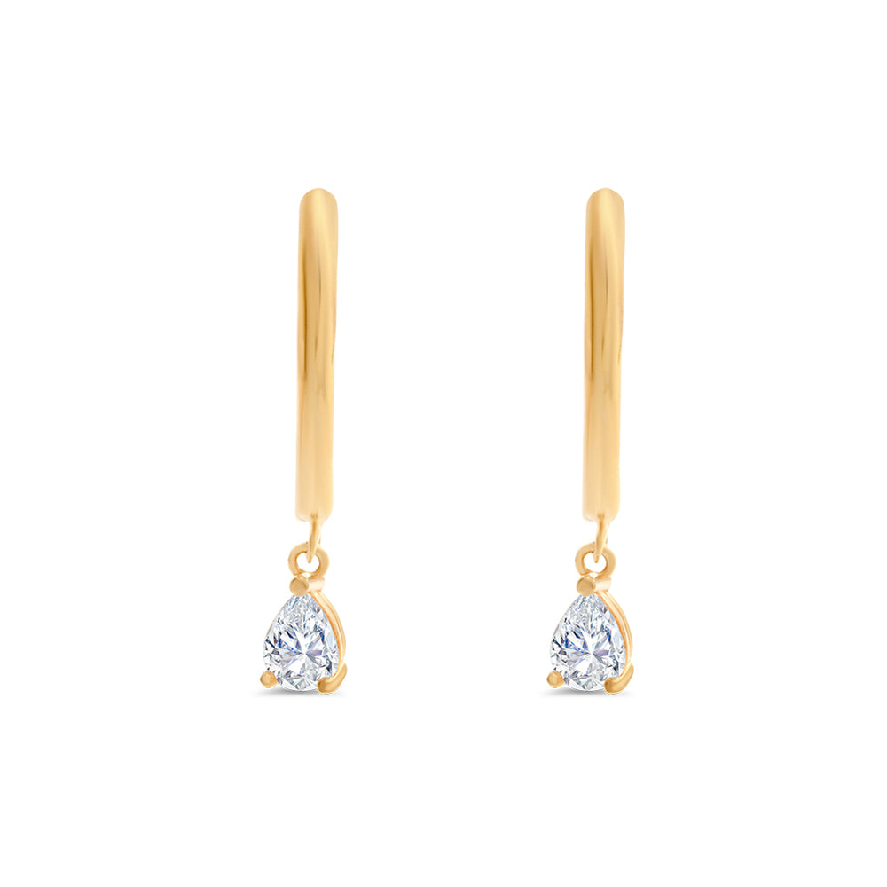 These earrings are made from 9ct yellow gold. Each earring features a huggie design, approximately 13mm with a claw set, pear shaped cubic zirconia at the bottom.