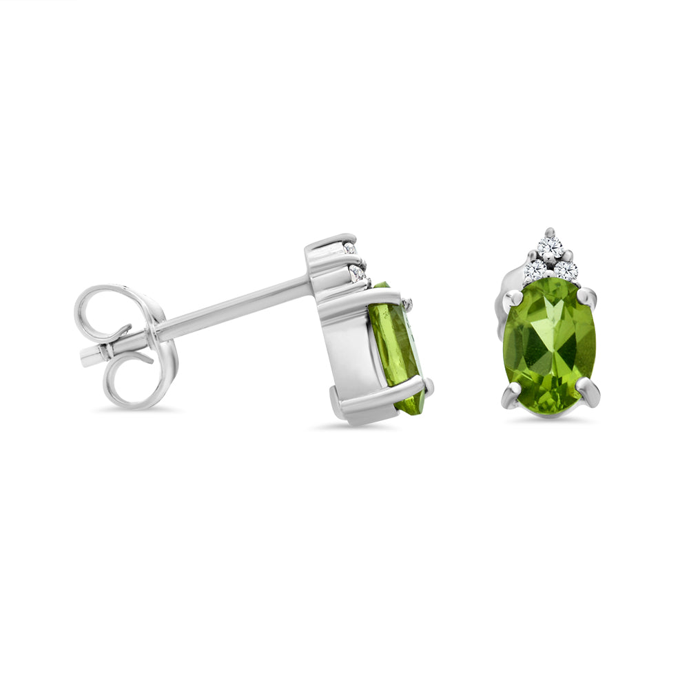 These earrings are made from 9ct white gold. Each one features an oval cut peridot in the centre set in a four-claw setting with three small round brilliant cut diamonds in claw settings at the top of the earring. These earrings have a stud fitting.