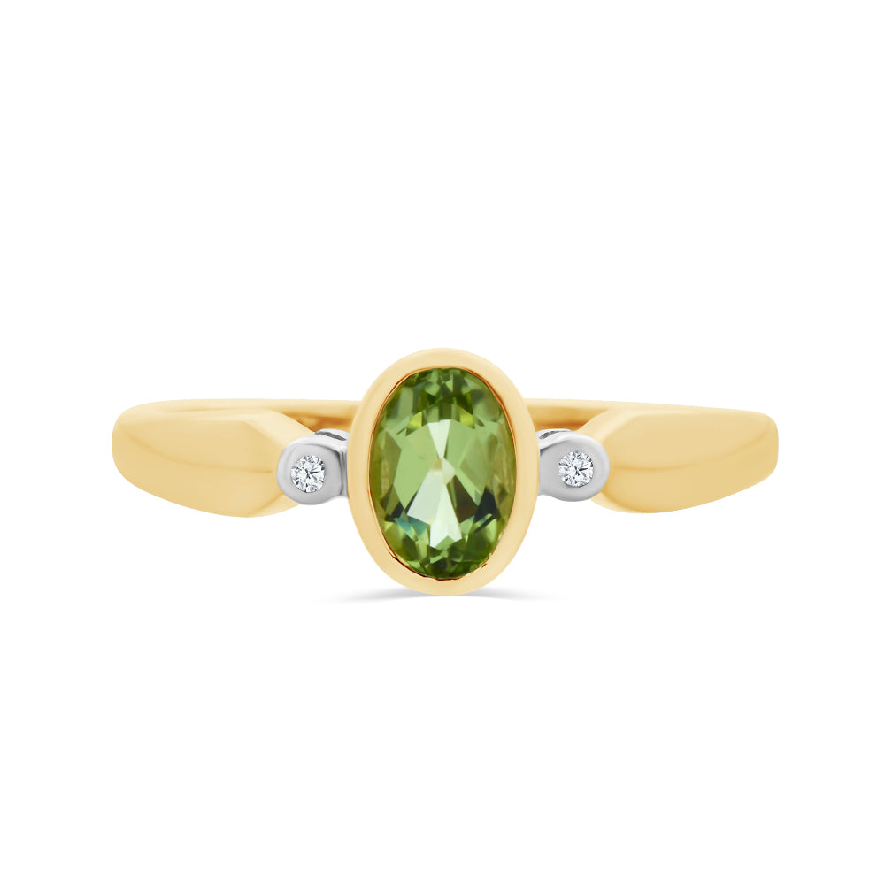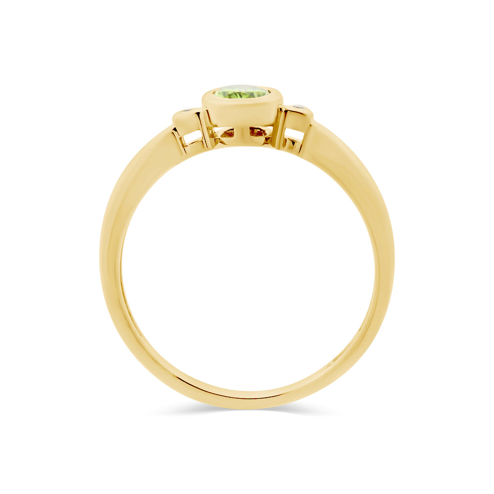 This ring is made from 9ct yellow gold and features an oval cut peridot in the centre in bezel setting. Each side of the oval is set with a round brilliant cut diamond that is also bezel set.