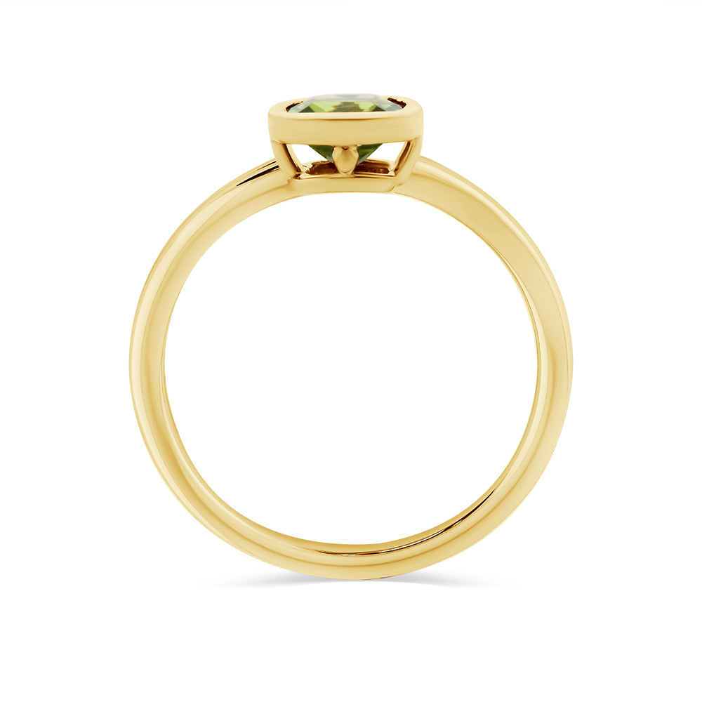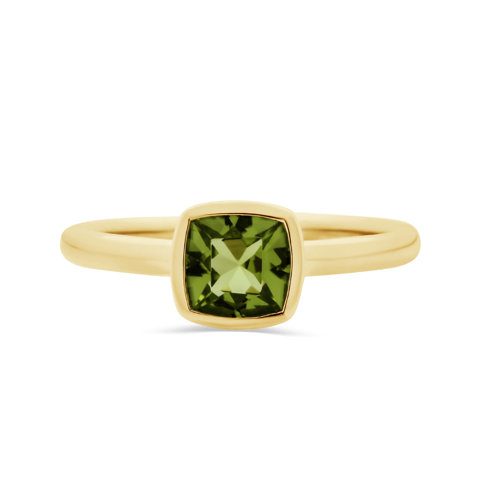 This ring is made from 9ct yellow gold. It features a cushion cut peridot in a bezel setting.