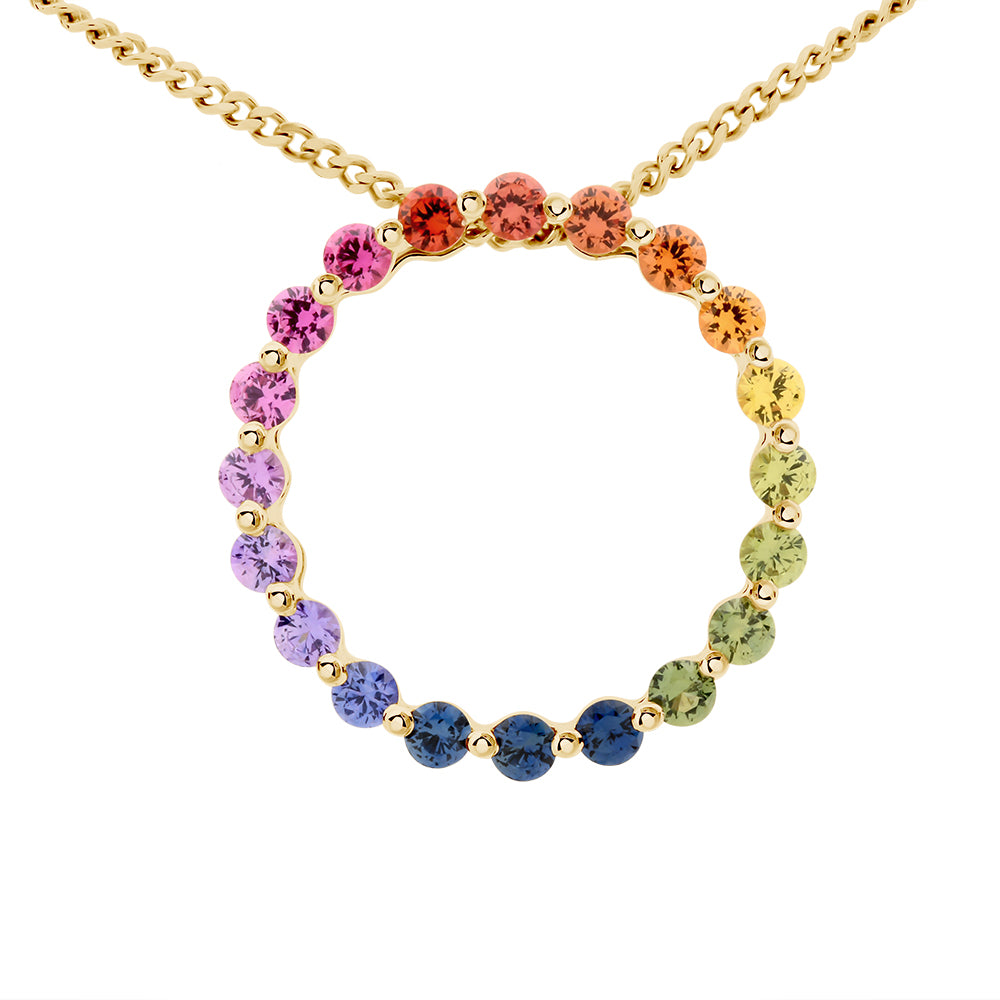 This pendant is made from 9ct yellow gold. It features 20 round brilliant cut sapphires in a rainbow of colours that are claw set in a circular design. This slider pendant comes on a complimentary 45cm yellow gold-plated display chain.