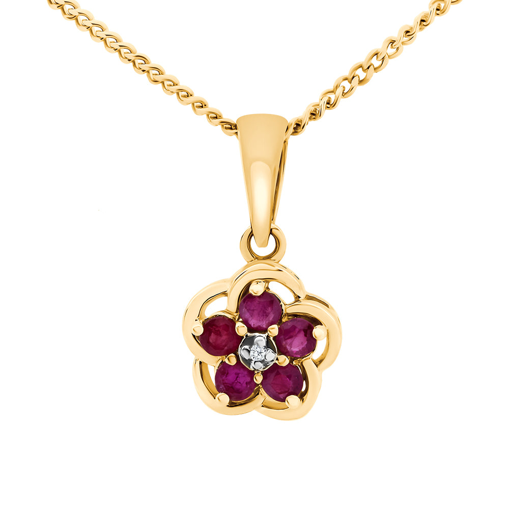 This pendant is made from 9ct yellow gold. The floral inspired design is centred around a round, brilliant cut diamond that is surrounded by a halo of 5 small claw set rubies with a gold frame. This pendant comes on a complimentary, 45cm yellow gold-plated display chain.