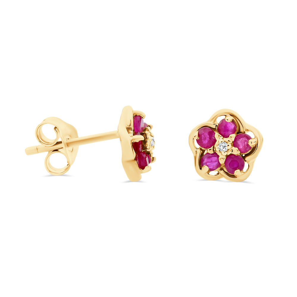 These earrings are made from 9ct yellow gold. Each of the floral inspired designs are centred around a round, brilliant cut diamond that is surrounded by a halo of 5 small claw set rubies with a yellow gold frame. These earrings have a stud fitting.
