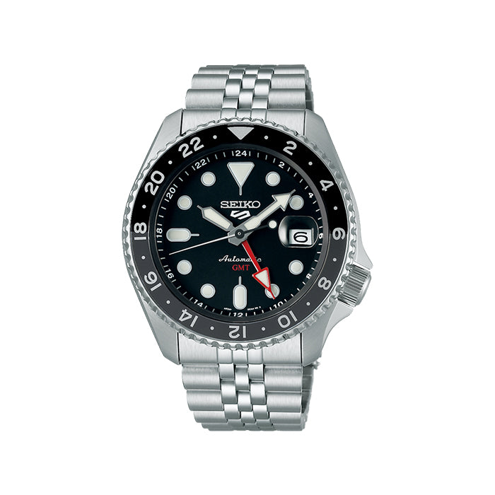 GMT: This watch features a black dial with silver toned hands and markers that feature LumiBrite, luminescence. The dial also features a date window as well as a bright red GMT hand, offering a second time zone. The case of the watch is 42.5mm and is made from stainless-steel as is the matching band. The look of the watch is finished off with an exhibition case back.