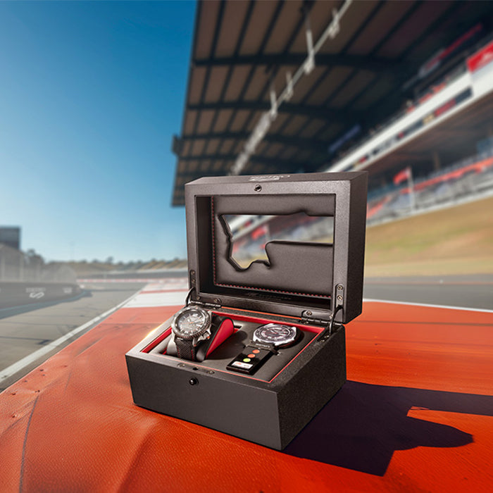 2025 LIMITED EDITION- Inspired by the race track this watch features a unique textured black dial that mirrors the raw surface of racing asphalt, with white and red highlights that have LumiBrite luminescence and a day/date window. The case of the watch is 42.5mm and is made from stainless-steel with black coating. This watch also features the SUPERCAR logo on the crown and grid inspired markers on the rotating bezel including the LumiBrite marker at 12 o'clock, a homage to the starting lights that signal the rush of competition. The look of the watch is then finished off with a combination red leather and black nylon band. The watch also features an exhibition case back engraved with the limited-edition number out of 2025 models. The watch comes with a specially designed collectors presentation box that features a detailed track map of the legendary Mount Panorama circuit in Bathurst as well as a scaled replica of the pitlane watch tower with the limited edition serial number engraved on the case back. .
