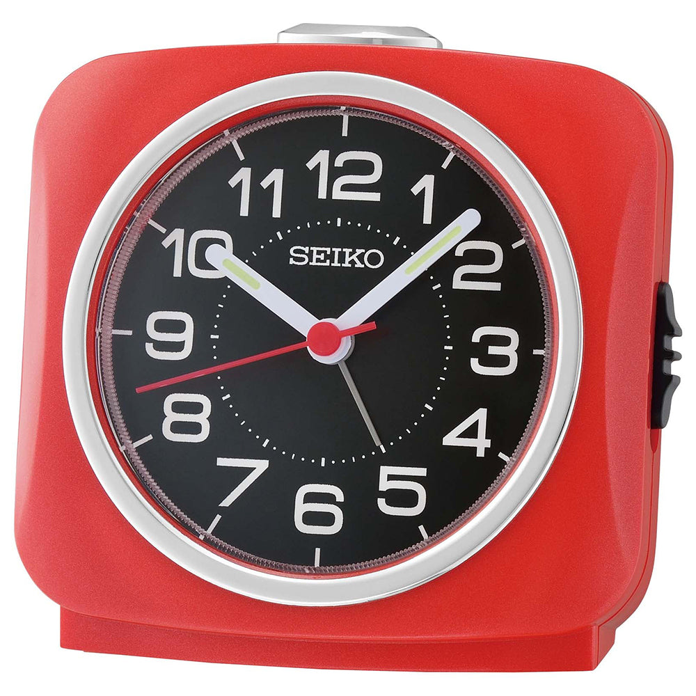 This red alarm clock from SEIKO is made from red plastic with a black dial, white numerals and markers and white hands filled with LumiBrite luminescence.