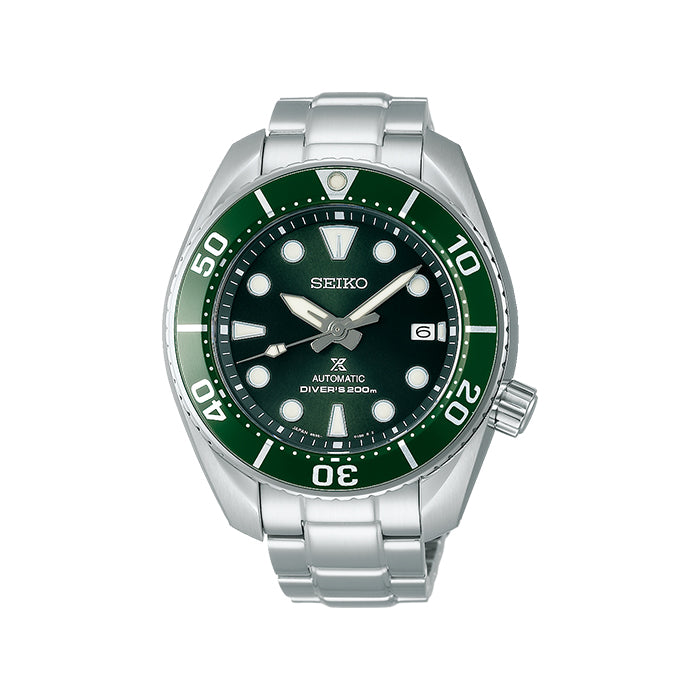 This automatic powered, divers watch is known by fans as 'THE SUMO' This SEIKO features a deep green dial with Lumibrite hands and hour markers as well as a date display and chronograph. A 45mm case is made out of stainless-steel and has a one-way rotating bezel and screw down crown. The watch also has a date feature.