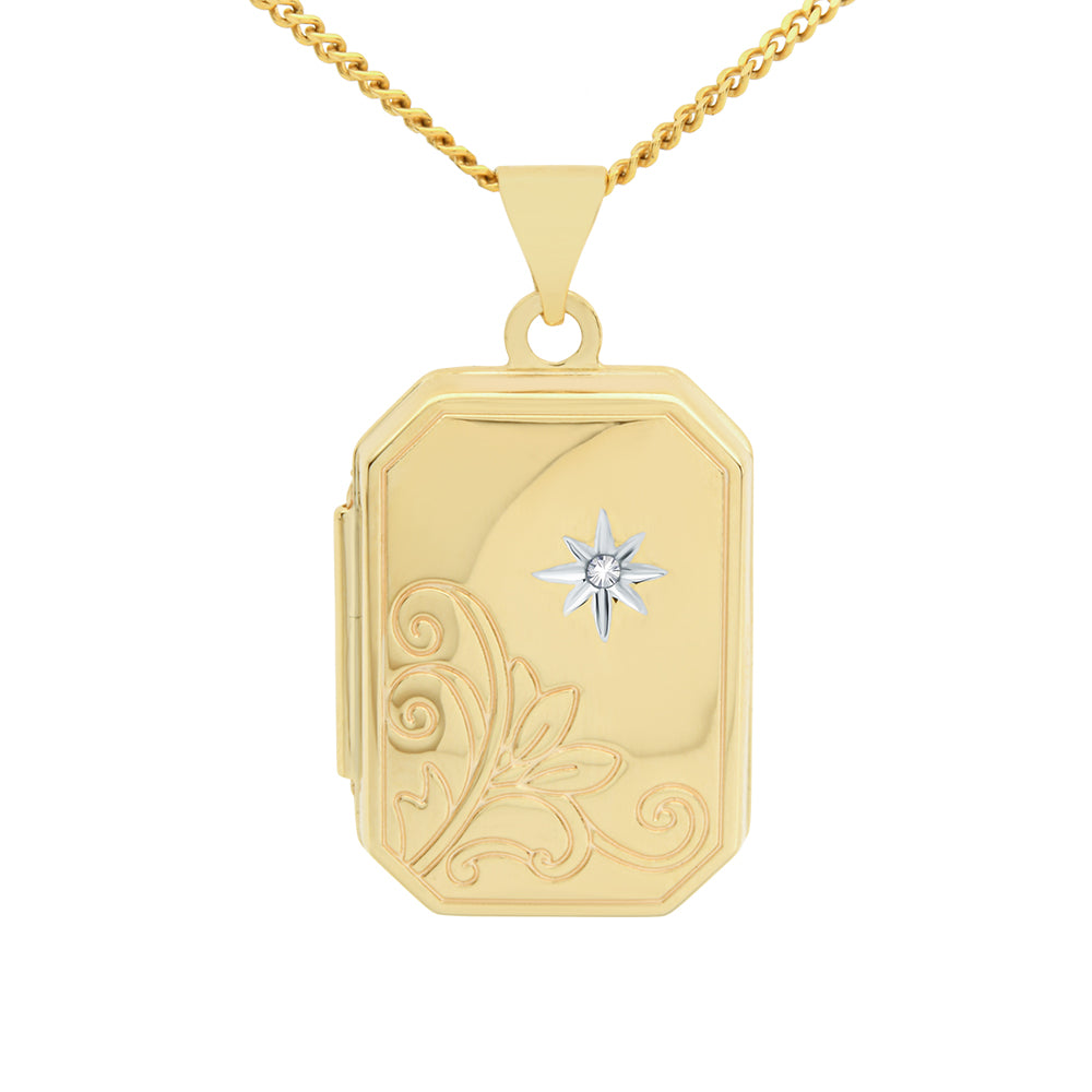 This locket is made from 9ct yellow gold. The oblong design is approximately 20x14mm and features a highly polished finish with an engraved corner and a star set diamond. This pendant comes on a complimentary, 45cm yellow gold-plated display chain.