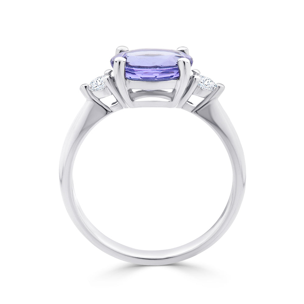 This ring is made from 9ct white gold. It features an oval cut tanzanite set horizontally in a four claw setting. Each side of the tanzanite is set with a round, brilliant cut diamond that is also caw set.