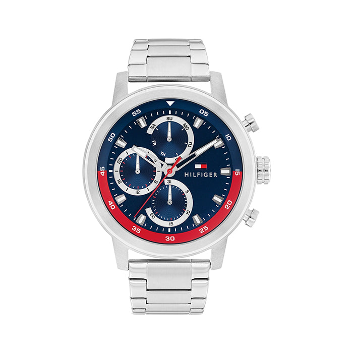 ROCKY: This watch features a blue dial with silver and red toned highlights, including a 12/24 hour sub-dial, and day and date sub-dials. The 46mm case of the watch is made from stainless-steel as is the matching band.